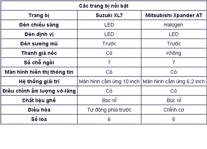 Nhìn chung, các trang bị trên Suzuki XL7 và Mitsubishi Xpander có nhiều điểm tương đương song ở một số thứ, cả 2 mẫu xe đều có những điểm khác biệt và Suzuki XL7 tỏ ra nhỉnh hơn đôi chút.