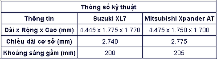 So với Mitsubishi Xpander, Suzuki XL7 ngắn hơn 30 mm, nhưng rộng hơn 25 mm và cao hơn tới 70 mm. Nhờ dài hơn Suzuki XL7 nên Mitsubishi Xpander có chiều dài cơ sở lớn hơn, đạt 2.775 mm (lớn hơn 35 mm). Tuy nhiên, dù Suzuki XL7 có chiều cao lớn hơn nhưng khoảng sáng gầm xe lại thấp hơn, ở mức 200 mm so với 205 mm trên Mitsubishi Xpander.