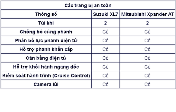 Về trang bị an toàn, Suzuki XL7 dù có giá bán rẻ hơn song cũng tỏ ra ngang ngửa so với Mitsubishi Xpander AT. Các trang bị Suzuki Ertiga còn thiếu để cạnh tranh với Mitsubishi Xpander cũng đã xuất hiện trên XL7 như cân bằng điện tử, hỗ trợ khởi hành ngang dốc hay kiểm soát hành trình.