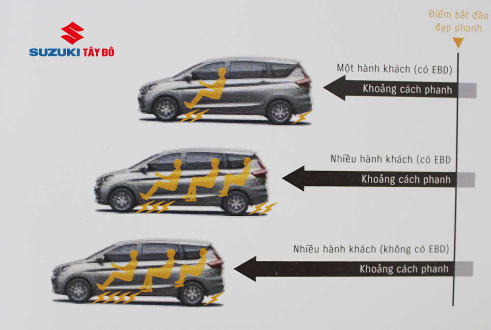 Ngoài ra, phân phối lực phanh (EBD) rút ngắn khoảng cách phanh bằng cách phân bố lực tối ưu cho bánh trước và sau nếu có tải trọng lớn, ví dụ như xe đầy hành khách.