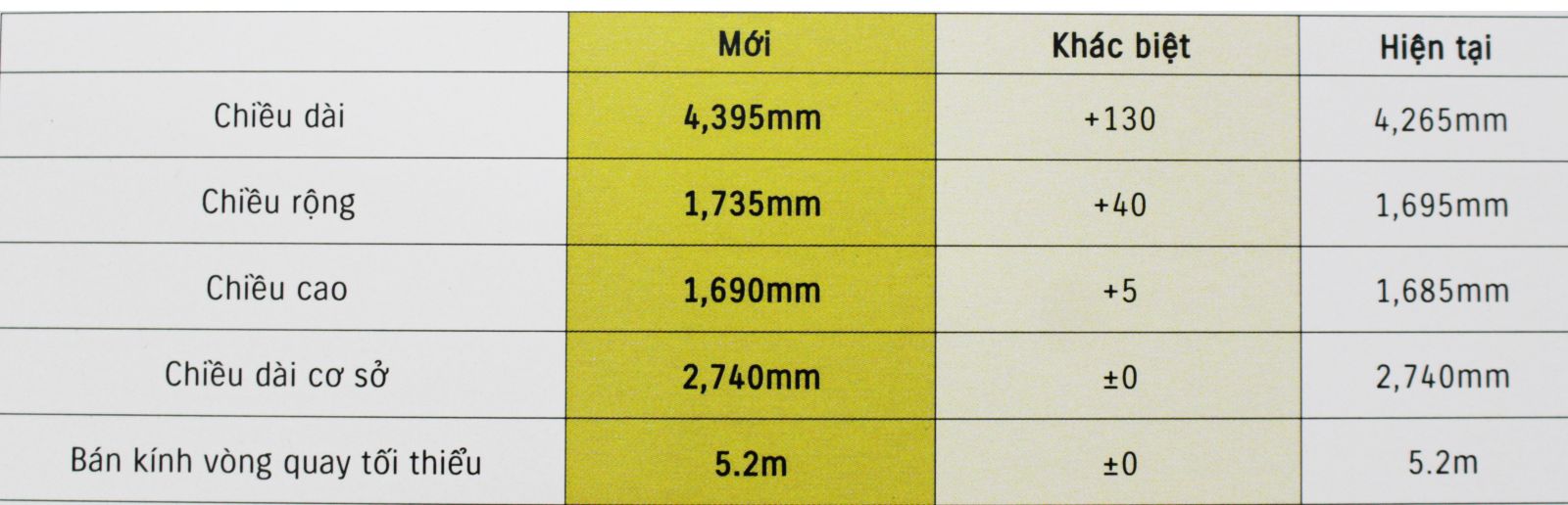 Curent vs New: Thân xe dài hơn, rộng hơn và cao hơn góp phần làm không gian nộI thất thoải mái hơn, trong khi đó chiều dài cơ sở và bán kính vòng quay tối thiểu không thay đổi làm cho xe vẫn dễ dàng điều khiển