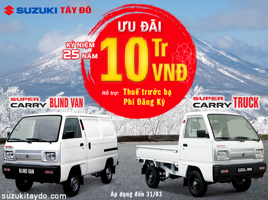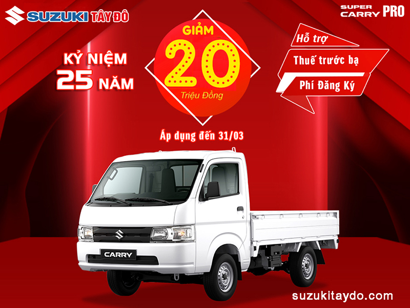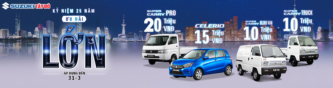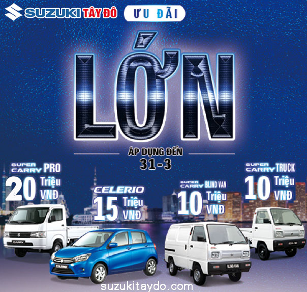 Cụ thể, dòng Celerio nhận hỗ trợ 15 triệu đồng, tương đương lãi suất trong 6 tháng đầu. Các dòng xe thương mại gồm Super Carry Pro nhận hỗ trợ 20 triệu đồng, Carry Truck và Blind Van nhận hỗ trợ 10 triệu đồng, tương đương lãi suất trong 6 tháng đầu. Chương trình diễn ra trên toàn quốc, áp dụng đến hết 31/3/2020.