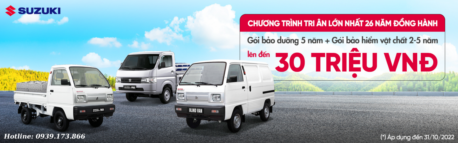 Từ 01/10 đến 31/10/2022, Việt Nam Suzuki triển khai chương trình tri ân lớn nhất 26 năm đồng hành, áp dụng khi mua một số dòng xe thương mại và du lịch, phục nhu cầu kinh doanh vận tải tăng cao và kế hoạch vui chơi vào dịp lễ gần cuối năm. Cụ thể: